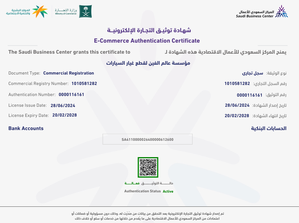 شهادة توثيق المتجر من مركز السعودي للاعمال